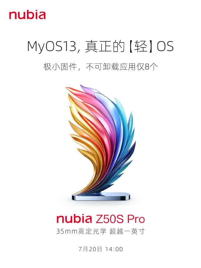 努比亚官微发布消息称,努比亚Z50S Pro将预装MyOS 13系统,“MyOS 13才是真正的‘轻’OS,更轻量、更纯净、不打扰,极小固件,不可卸载应用仅8个,再次挑战最少广告系统。”