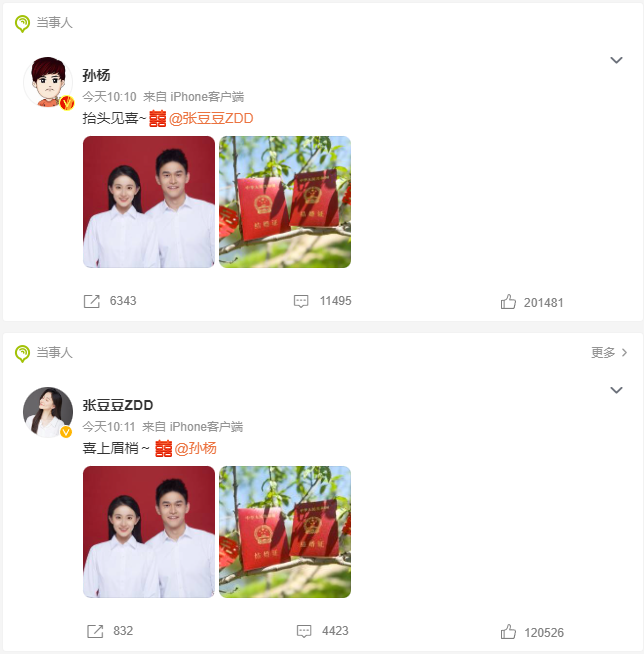 今日上午,著名游泳运动员孙杨宣布与前艺术体操运动员张豆豆结婚。两人在微博官宣结婚并晒出结婚照和结婚证。