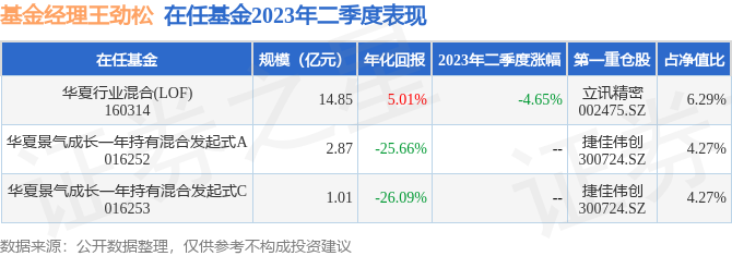 截止2023年二季度末,基金经理王劲松旗下共管理3只基金,本季度表现最佳的为华夏行业混合(LOF)(160314),季度净值跌4.65%。