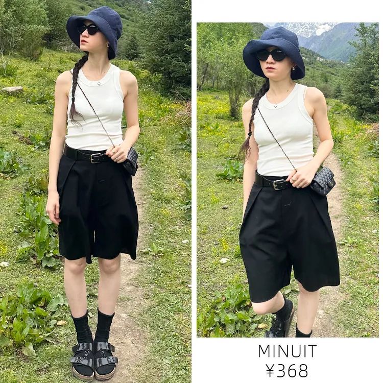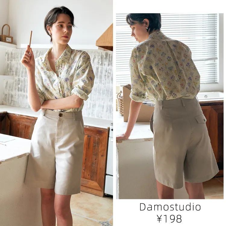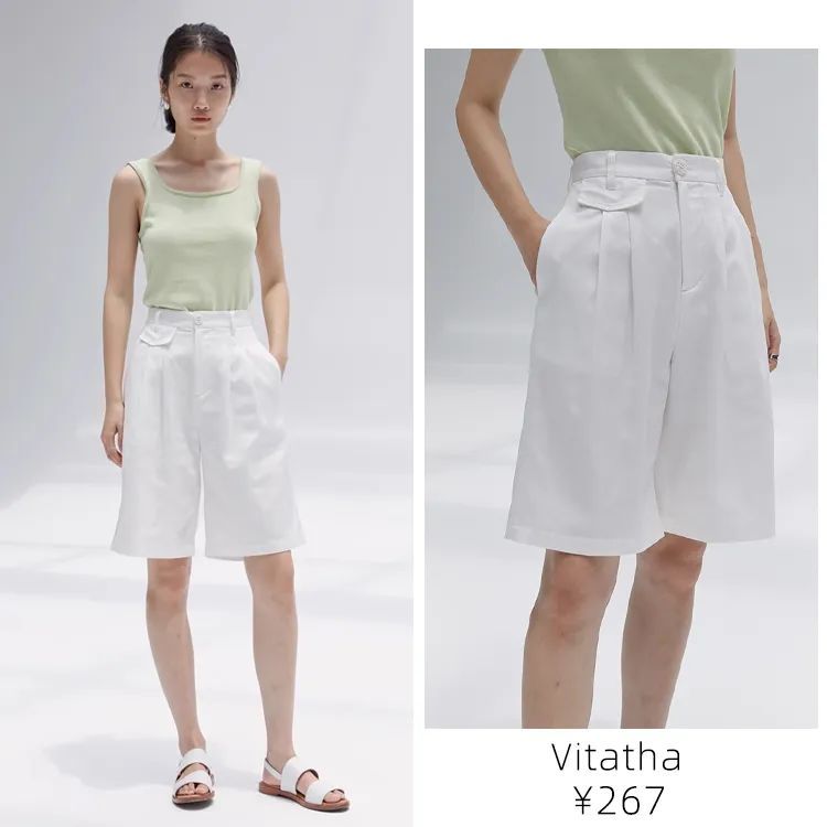 挑百慕大短裤千万别选廓形感太强的,会比较难hold。利落的直筒或者小阔腿的裤型会更加好穿好搭。