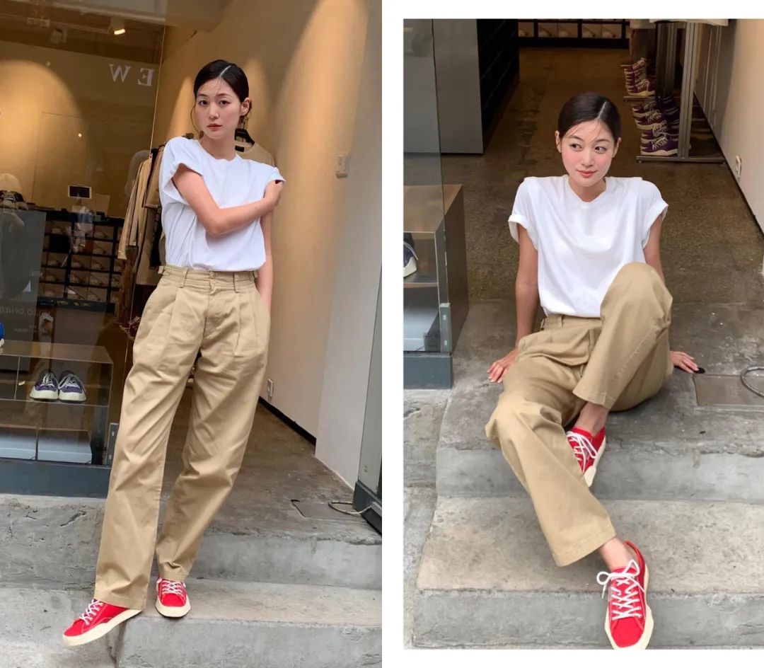 还有卡其色休闲裤也蛮时髦,直接搭个白T看上去就很舒服。