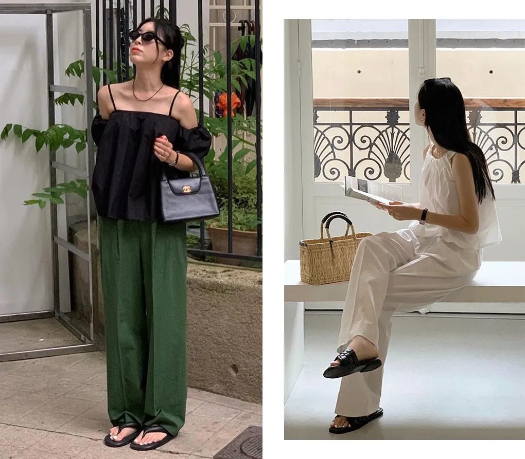 这种直筒的西装裤,搭配背心和拖鞋,就会有休闲又自在的氛围~