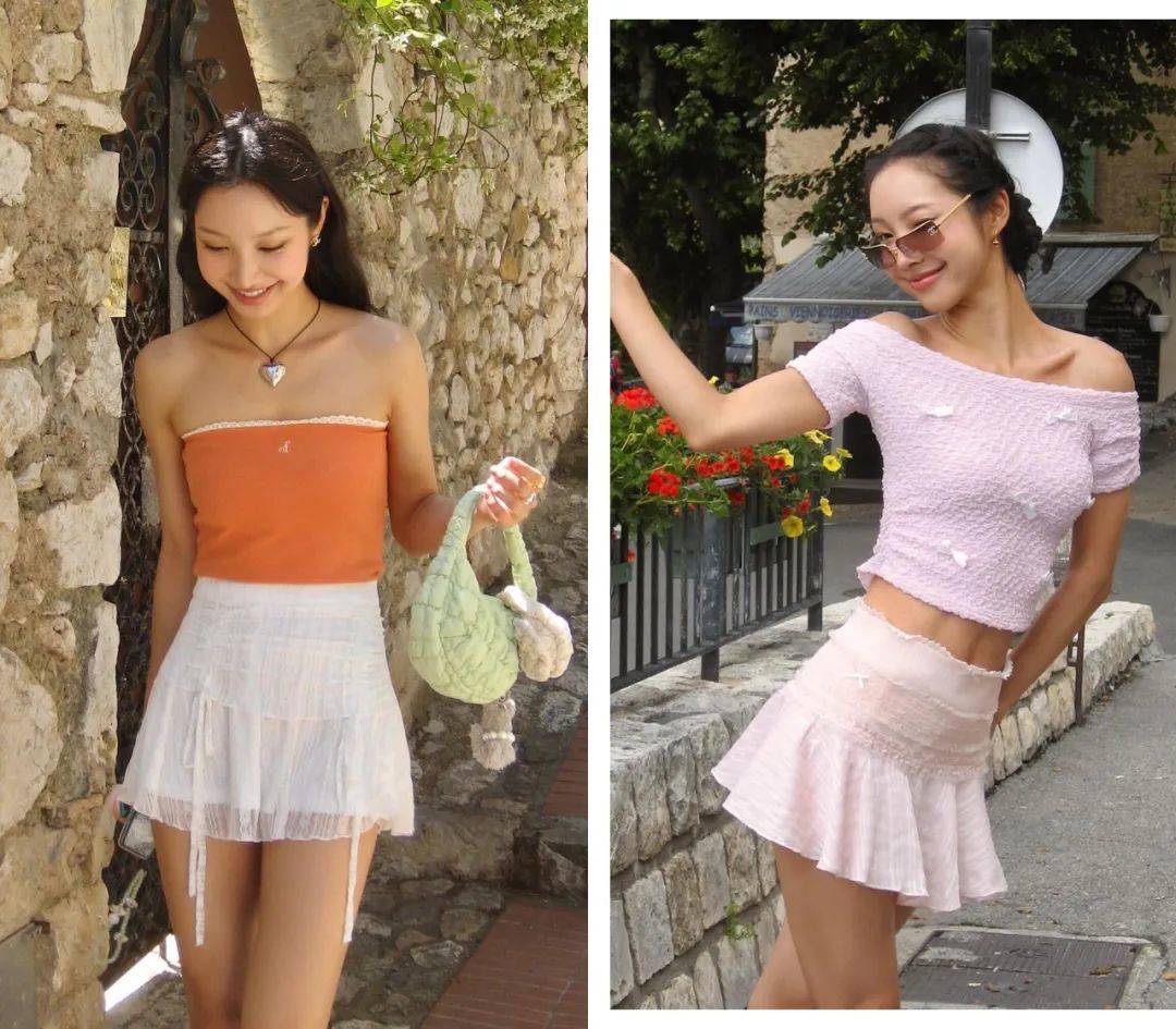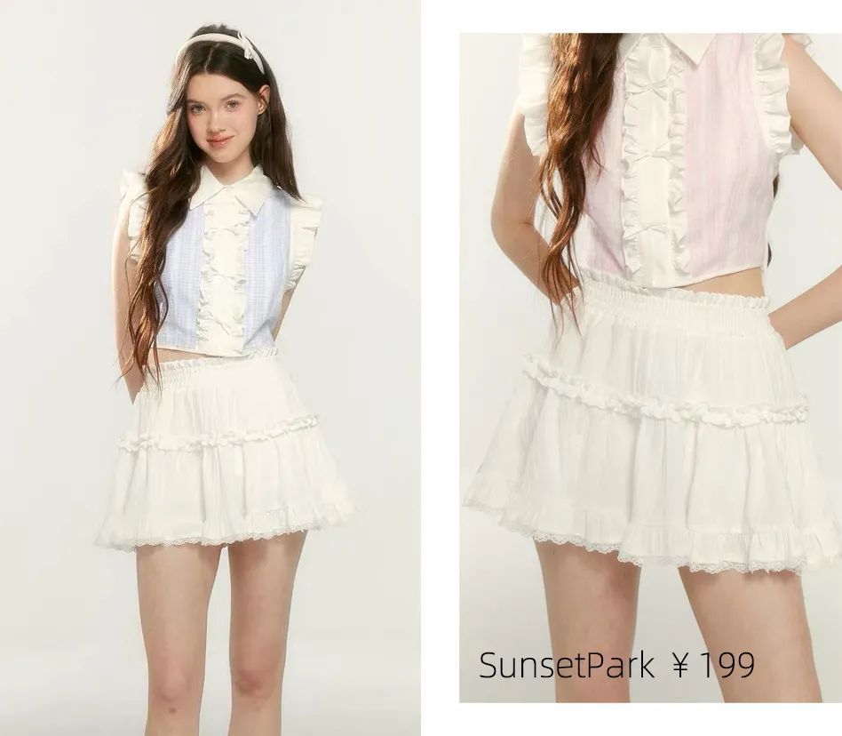 韩国女生喜欢这种白色花苞短裙,搭配彩色上衣有芭蕾风的感觉。