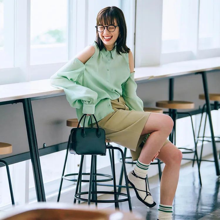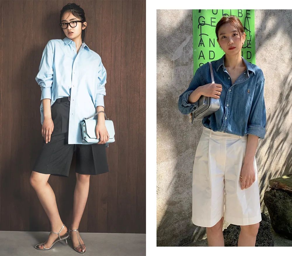 日常通勤的话还是穿五分长度的百慕大短裤会更加合适,配上一件衬衫就完成上班look啦。