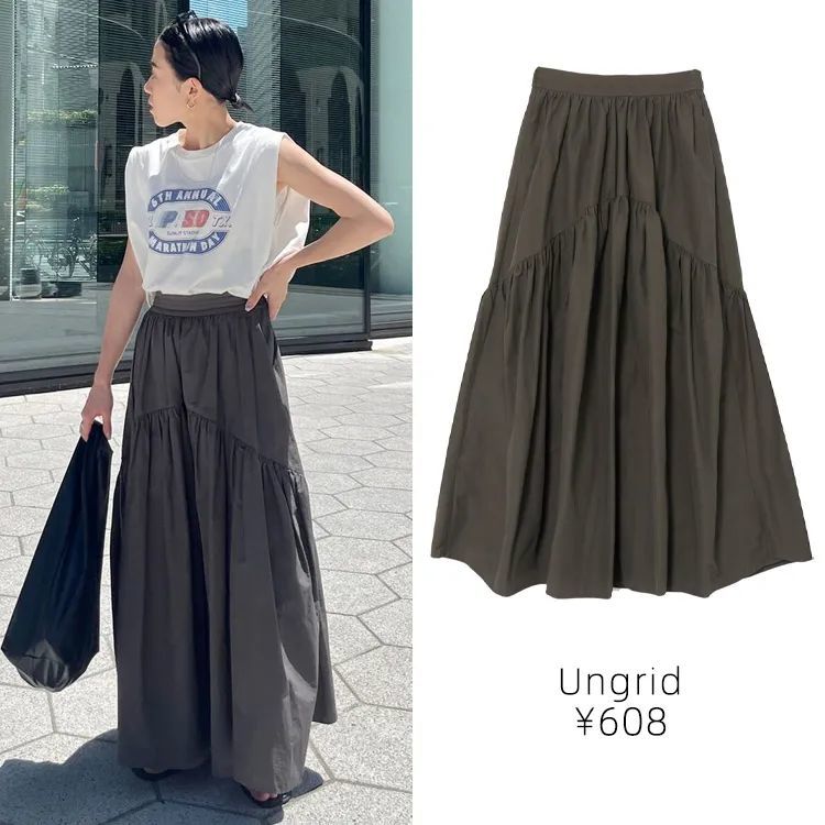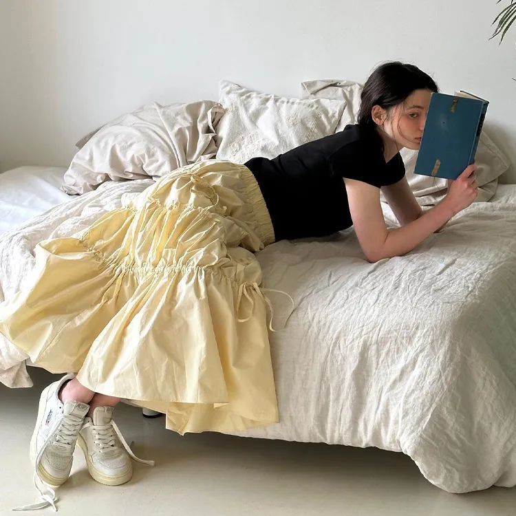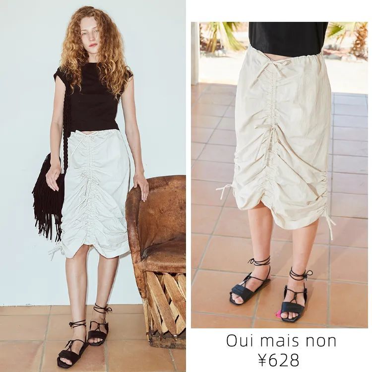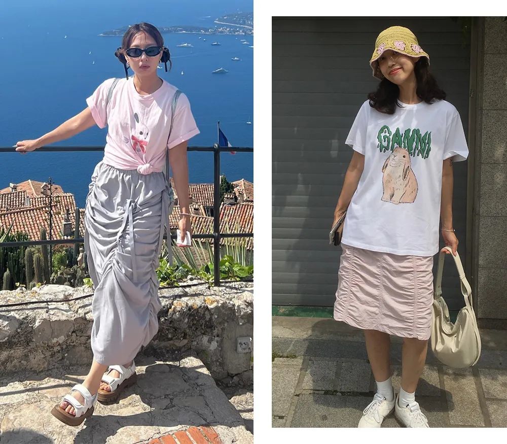 很推荐大家入手一条拥有褶皱元素的半裙,随便搭配一件T恤就超出彩。