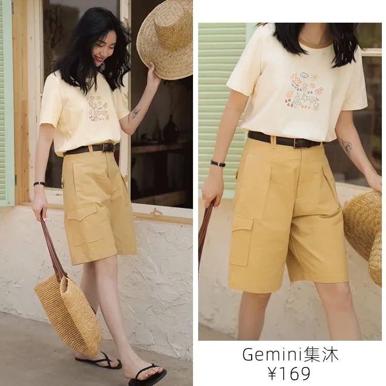 五分工装裤又是不一样的随性洒脱,卡其色自带的复古调调,随便搭都很日系感。