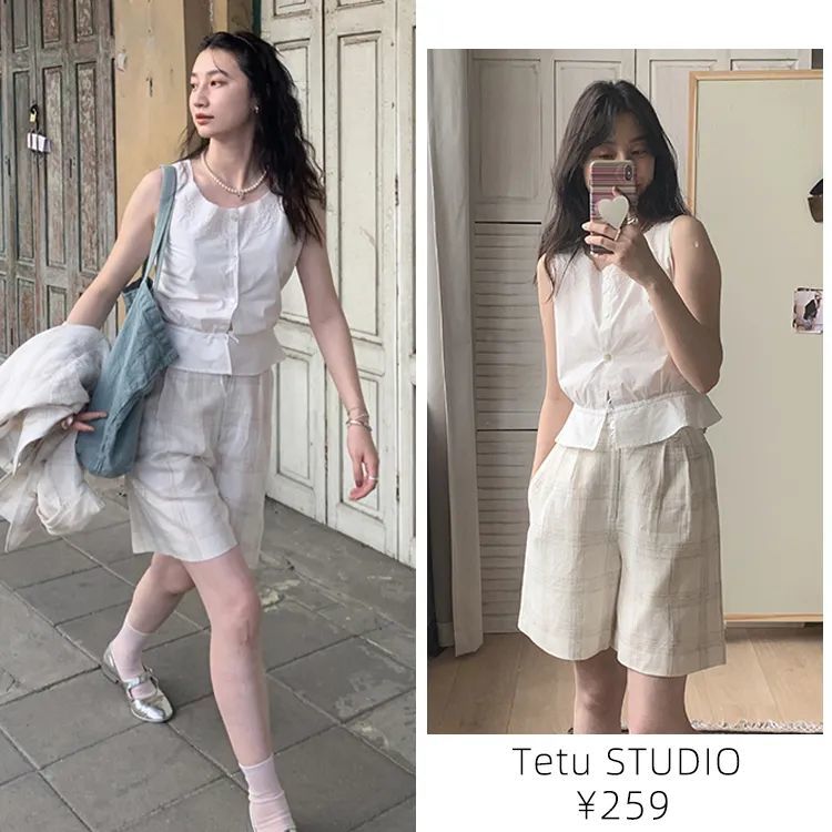 TetuSTUIDIO这条格纹短裤看起来就很清爽干净,跟各种白上衣简直是perfect match。