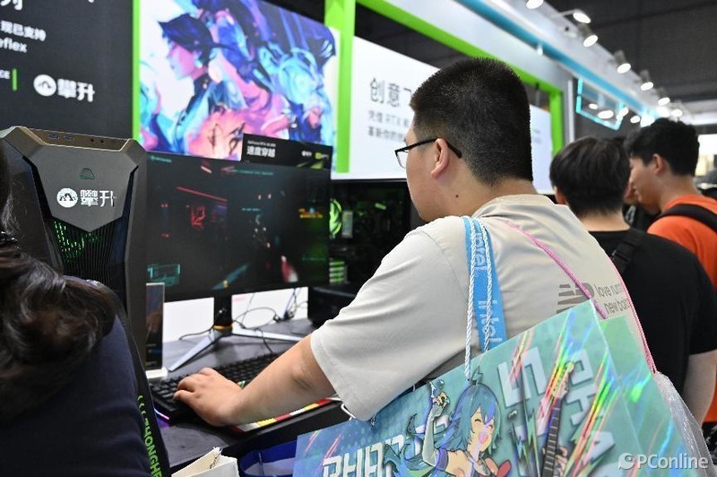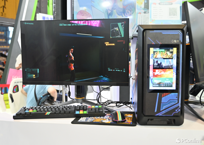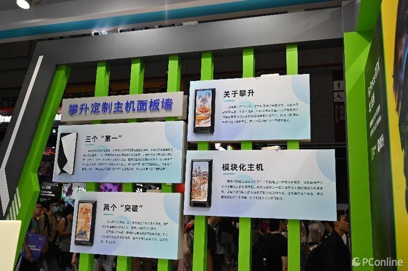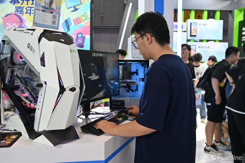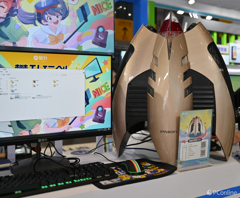 在电竞体验区不仅可以体验到最新的游戏技术,还可以看到攀升积极创新的各种模块化主机,其中有着获得了德国红点奖的炫酷异形机箱UFO以及兰洋科技带来的全新浸没式液冷主机2.0,在传统主机方面,攀升展出了前面板采用RGB灯条的战境S7和武极·武神。