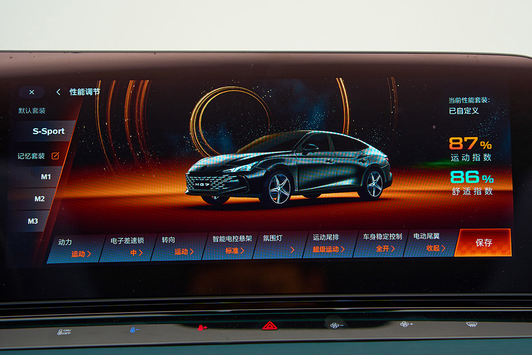 除了激活运动模式让悬架与转向系统进入运动状态之外,驾驶者还可以在MG7独特的X-MODE超级玩家模式中对动力输出特性、悬架模式、排气模式等众多参数进行个性化调节,从而找出最适合自己的个性驾驶模式。
