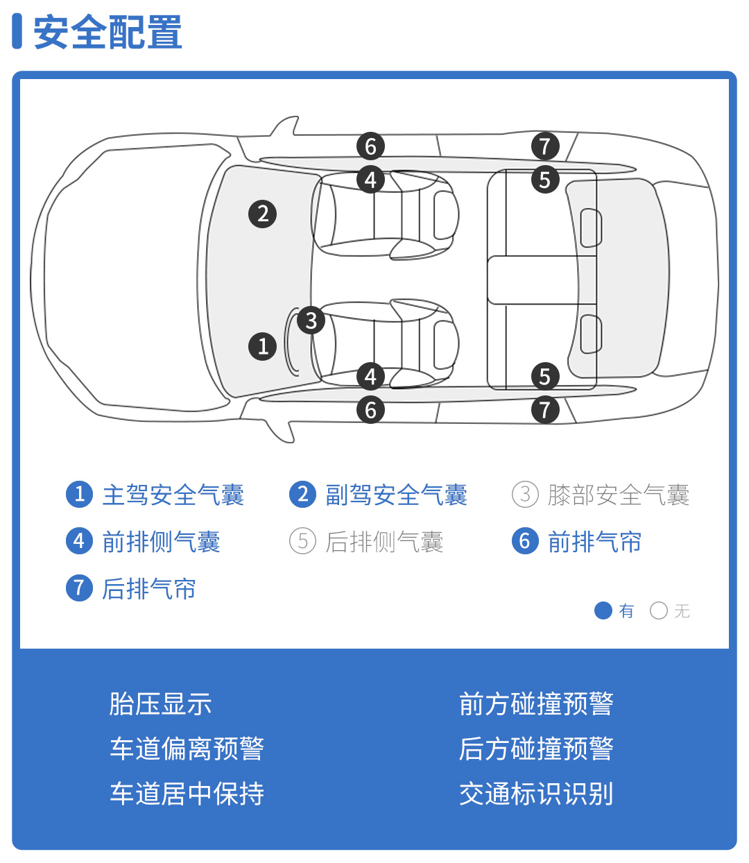 同时,主被动安全配置也被拉满,全车共提供6个安全气囊,结合前后方碰撞预警、侧方碰撞警告、道路交通标致识别等实用主被动安全配置的共同加持下,为日常用车生活提供全方位的安全保障。