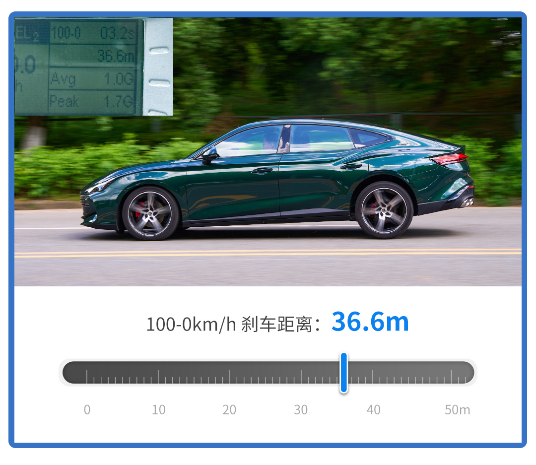 而在制动测试中,MG7只用了36.6m就将完成了从100km/h到完全静止的减速过程,且在制动过程中没有出现任何车身摆动、跑偏等情况,让人感觉非常放心。