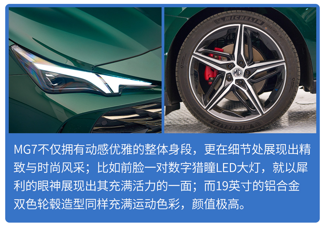 只需一眼,MG7就能用颜值打动你,不仅是因为这质感满满的翡冷翠车漆,更因为这流畅的车身曲线与五门溜背轿跑舒展的体态,让MG7看起来非常优雅、时尚。