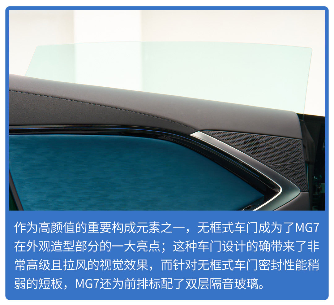 此外,得益于双层隔音玻璃的应用,纵使MG7采用了无框式车门设计,它也依旧实现了出色的车厢静谧性,对环境噪音充分地隔绝于车外,只留下恰到好处的引擎声浪,以彰显优雅轿跑的动感魅力。