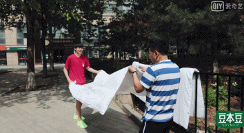 父子俩去晒被子,把羽绒被里的羽绒抖出来了,丝毫没有负面情绪,也不慌乱,反而打起了羽毛战。