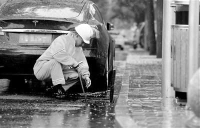 北土城西路防汛点的工作人员打开路边雨篦子进行清理摄影/本报记者 袁艺