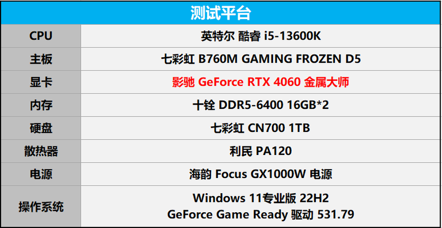 本次测试使用的是公版频率的影驰GeForce RTX 4060金属大师显卡,搭配主流级i5-13600K处理器和DDR5-6400内存平台,完整配置如下。