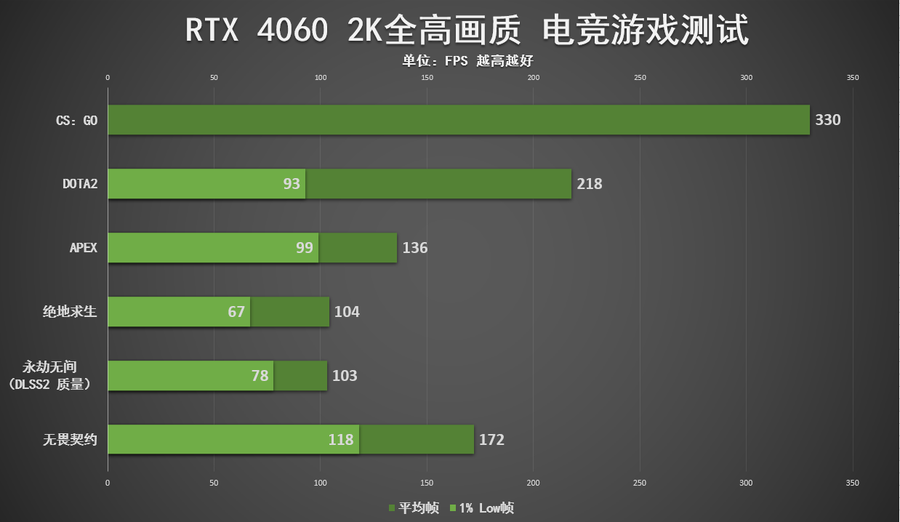 可以看到,RTX 4060完全可以在2K全高画质下,是完全可以满足《CS:GO》《DOTA2》《无畏契约》的144帧运行的,同时在《APEX》《绝地求生》《永劫无间》当中平均也能达到过百帧,适当降低画质后(如流行的“3极 致”画质等)基本可以稳定2K 120帧以上。