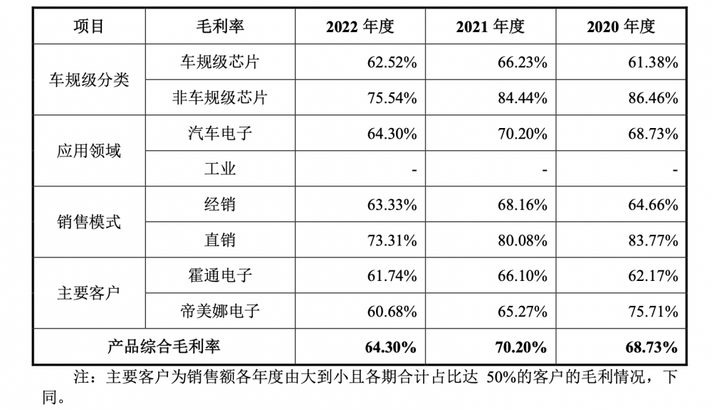 拆分赛卓电子针对问询函的回复不难发现,在车规级芯片与非车规级芯片方面,报告期内公司速度传感器芯片在2021 年受下游汽车产业链“缺芯”影响,毛利率出现了明显上升,但2022年受原材料晶圆成本上升影响,毛利率下降。