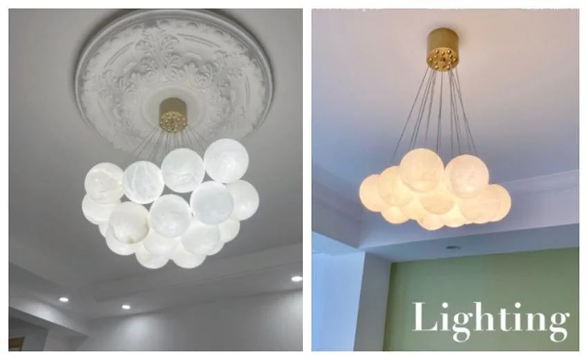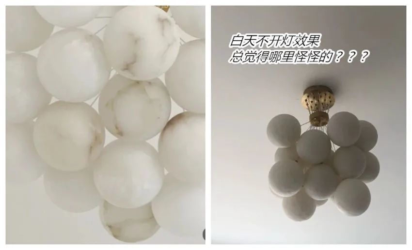 拿最近网上火爆的云石球灯来讲,灯泡上自带纹理,本以为有星空的效果,但开灯后反而感觉怪怪的;白天不开灯,单独挂着也没多好看,仿佛一串葡萄。