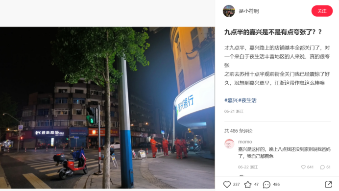 这是九点半的嘉兴,路上的店铺已经关得七七八八,还有网友现身说法,“晚上八点还没到家,别说爸妈了,我自己都着急”。