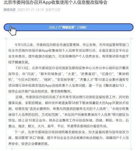 7月13日,北京市委网信办与国家互联网应急中心北京分中心共同召开整改指导会,针对专项治理行动中发现的App违规收集个人信息问题向10家企业通报,并逐一下达《整改通知书》,要求企业开展产品合规改造,并限期整改。受到通报的App包括闪送、顺丰同城急送、大麦、赶集直招、亿通行、黄油相机、今日水印相机、绿洲、宝宝树孕育和齐鲁人才。