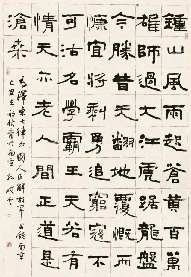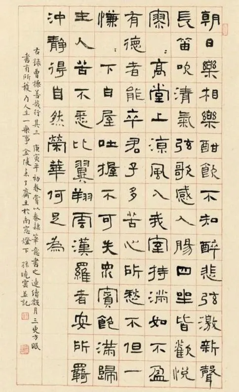而卢中南老师的隶书,整体上看起来更加传统,尤其是突出了《曹全碑》的笔意,同时也是走出了一条传统之路,仔细观察,我们还会发现,卢中南老师的隶书还有伊秉绶的整齐划一,严谨规范,相比孙晓云的隶书,显得更加方正了不少,这也是很明显的差别,也许是他们对隶书的理解和见解不同所导致吧。