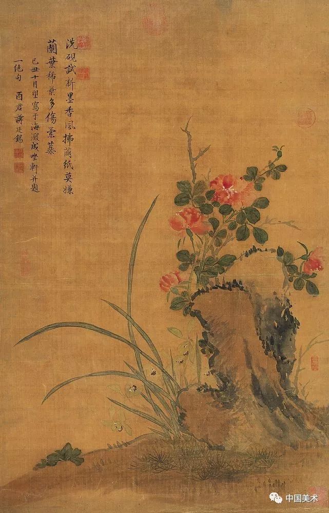 蒋廷锡有一首《扶郑羲赠花卉卷长歌以报》,非常能反映他对花鸟画传统的看法。诗的前面一半写马元驭绘制花卉笔力之高,后一半写的是他对历史上著名花鸟画家的评价:“华光和尚画者师,得其传者杨补之。徐熙双勾已妙绝,崇嗣没骨尤独奇。下至黄筌与钱选,晕碧裁红颜色显。木雕死印虽刻划,生趣活泼未尽善。吴中沈周石田翁,手腕随处生春风。特为古人开生面,今之学者称正宗。吾子本领复谁让,当时应在包山上。胆大运起抗鼎笔,精思肖出纤毫状。感君赠我画十幅,我为报君歌一曲。画长歌短君莫轻,归来补写千竿万竿竹。”其中可见他对徐熙的双勾法和徐崇嗣的没骨法较为服膺,而对黄筌、钱选的平涂设色画法感觉不够有生趣,他最为推崇的花鸟画家是沈周,而认为马元驭的技法不在陆治之下。