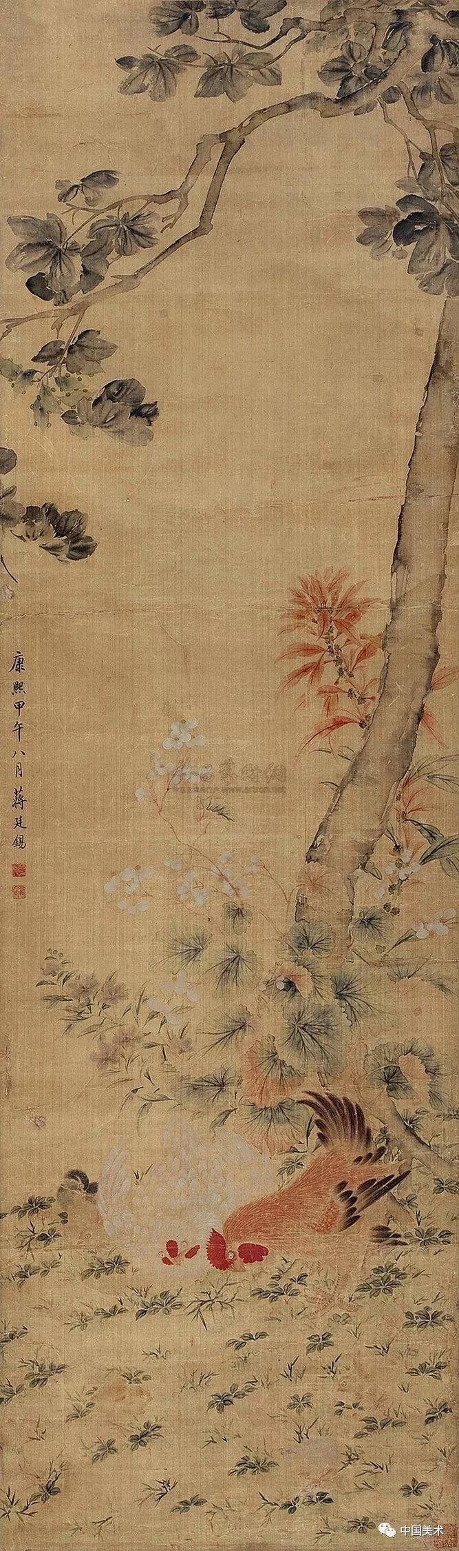 蒋廷锡 (款) 甲午(1714年)作 群鸡 立轴 尺寸:171×51cm