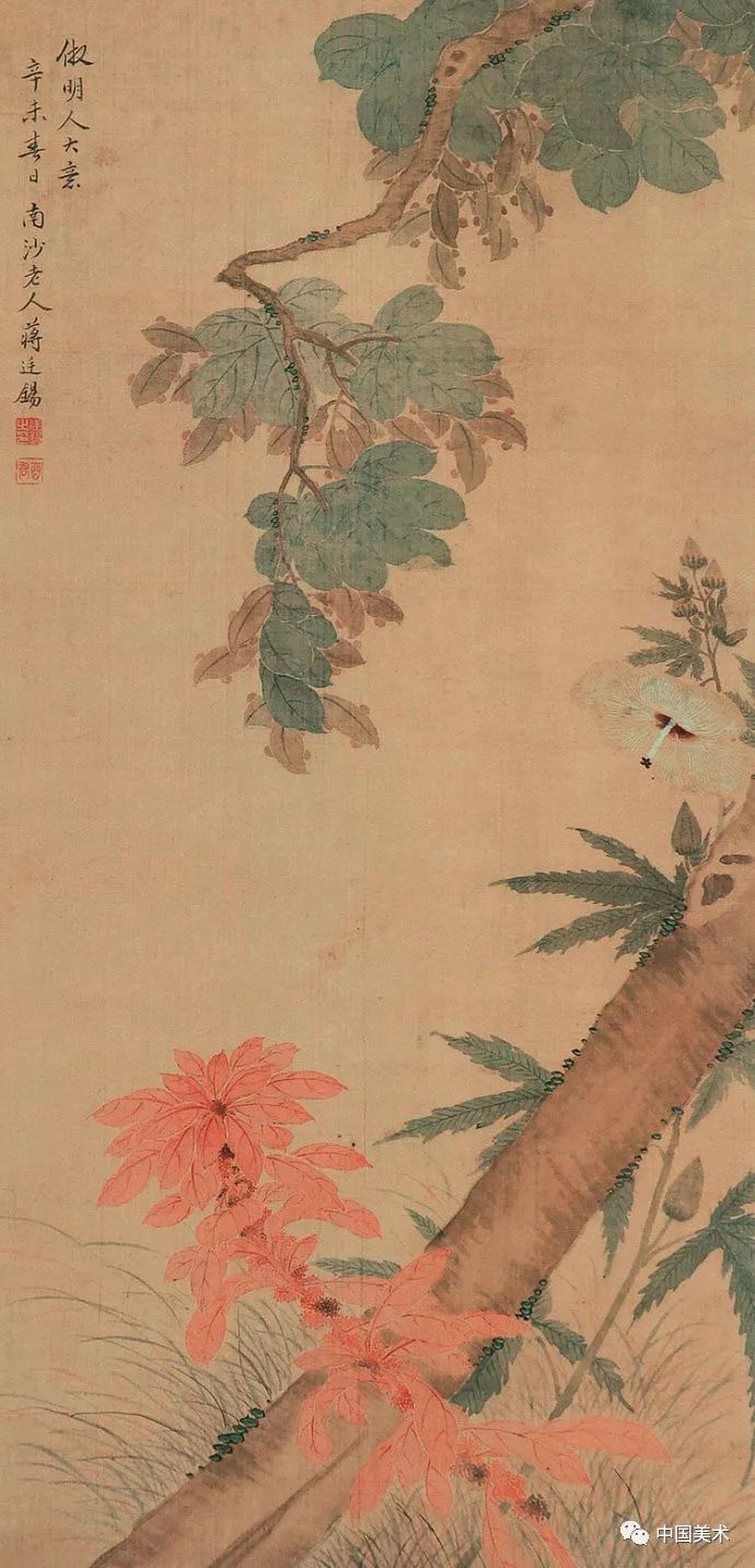 南京博物院所藏其《海棠牵牛图》就是一幅没骨法与勾勒法并用的作品。画中翠竹与牵牛花朵、海棠花朵都用墨线勾勒,各分浓淡,略施了淡彩以后,也是洗尽铅华、不着妖媚。依画中所题“模元人笔法”,画家可能有意取元朝画家陈琳(仲美)、王渊(若水)之法。蒋廷锡还曾在两幅花卉册页中题:“不生不熟,颇得元人用笔,唯墨气少神,功夫不到耳。”“勾描尚存南宋人意,不用焦墨,恐落浙派耳。”其实这两幅画都采用了没骨与勾勒并用,设色浅淡,枝叶的浑融不着笔迹已与南宋人的细腻勾勒相去甚远,淡墨勾勒花瓣略作晕染,墨分浓淡写叶之向背的方法非常像元朝张中(子政)。这与张庚形容的他所见到的蒋氏作品非常接近:“尝于海昌查氏见扇上画拒霜一枝,以率笔勾花及跗,渲以淡色,而以工笔点心,累累明析。叶用墨染亦工致,旁发一稚枝以焦墨染三蕊于上,蒂用双勾,笔笔名贵。”