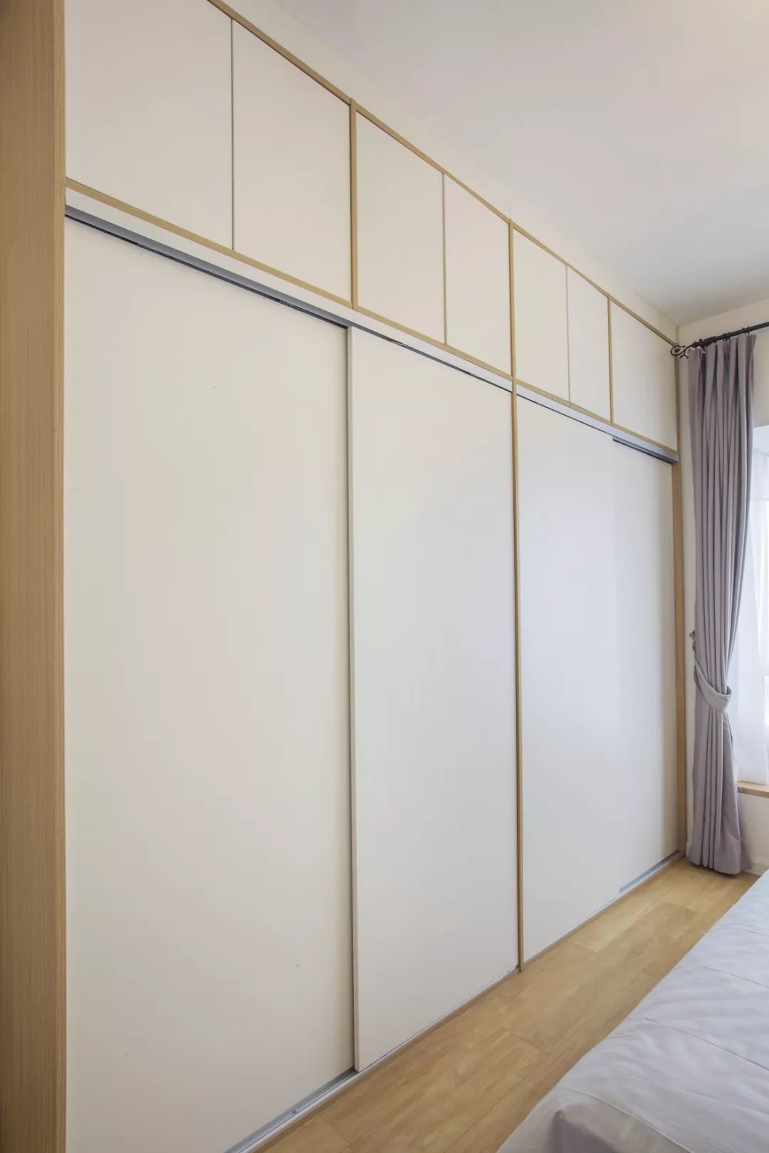 ▲床尾装一排推拉门衣柜,衣柜上装了到顶的吊柜,顶部吊柜可以放置行李箱、换季被子等物品,打造了一个简约大方而实用的卧室空间。