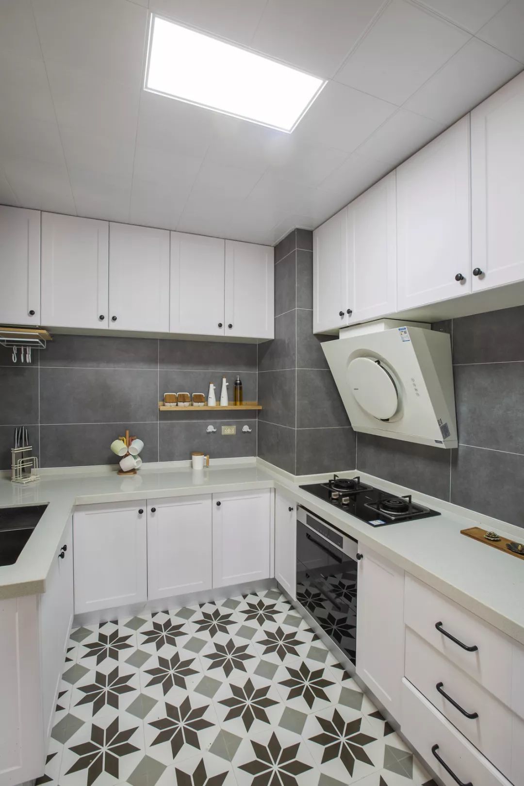 ▲厨房以灰白色的几何图案地砖,以灰色墙面砖,装上白色定制橱柜,搭配白色油烟机与操作台,在U字形的操作台格局下,营造了一个实用而又文艺的厨房空间。
