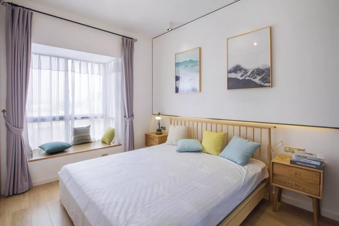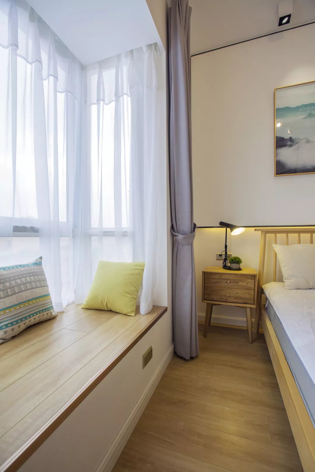 ▲卧室同样以木地板与简洁的墙面天花,床头墙挂两幅简约山景挂画,摆上一套实木床、床头柜,而飘窗窗台也都是原木质感的,搭配灰色窗帘、米白色床单,整个空间都充满简约自然的气息感。