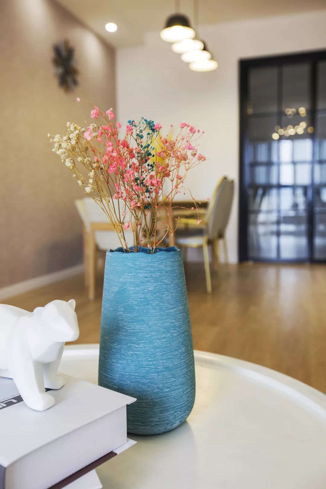 ▲电视柜上布置陶艺品、金属架与盆栽等装饰,茶几布置一个蓝色花瓶+插花,简单雅致的布置,也让简约的空间更加清新细致,增添生活乐趣。