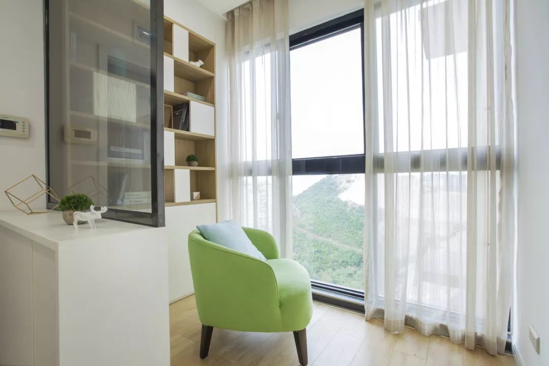 ▲书房里面布置休闲沙发椅,定制一个书柜,窗帘以透光纱帘的搭配,打造了一个休闲阅读的惬意空间。