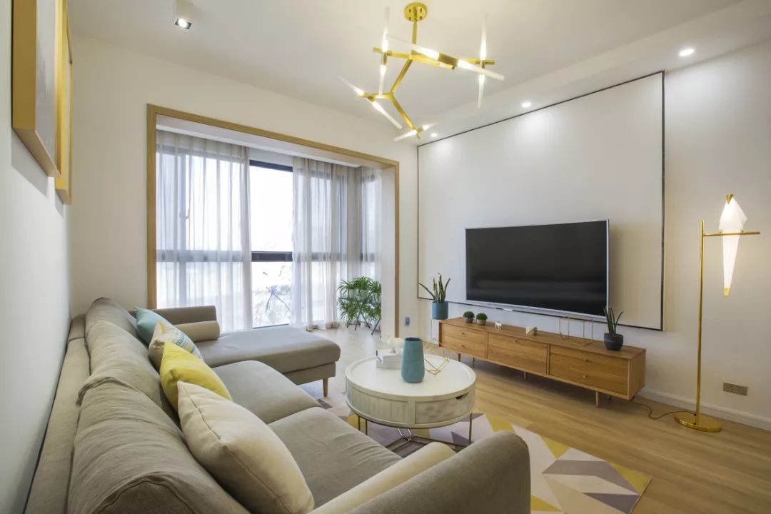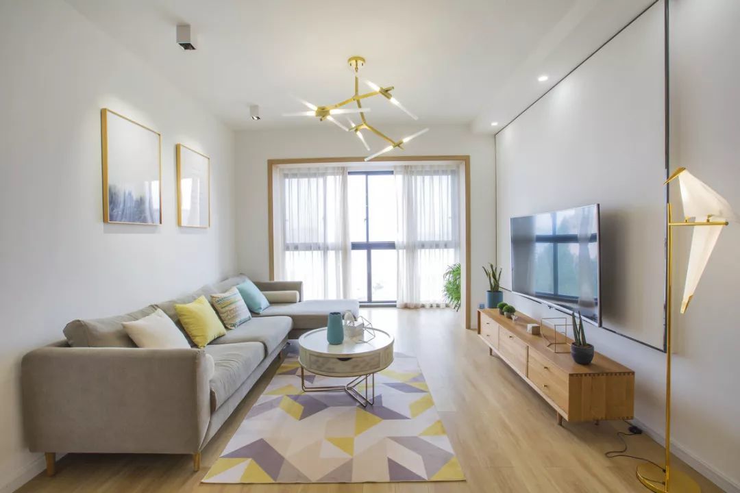 ▲客厅与阳台打通,使得客厅显得宽敞而又明亮;天花与墙面都简单洁净的空间,地面以浅色木地板基础,铺上灰白黄色的几何图案地毯,搭配简约家具,整个客厅充满充满简约舒适的氛围感。