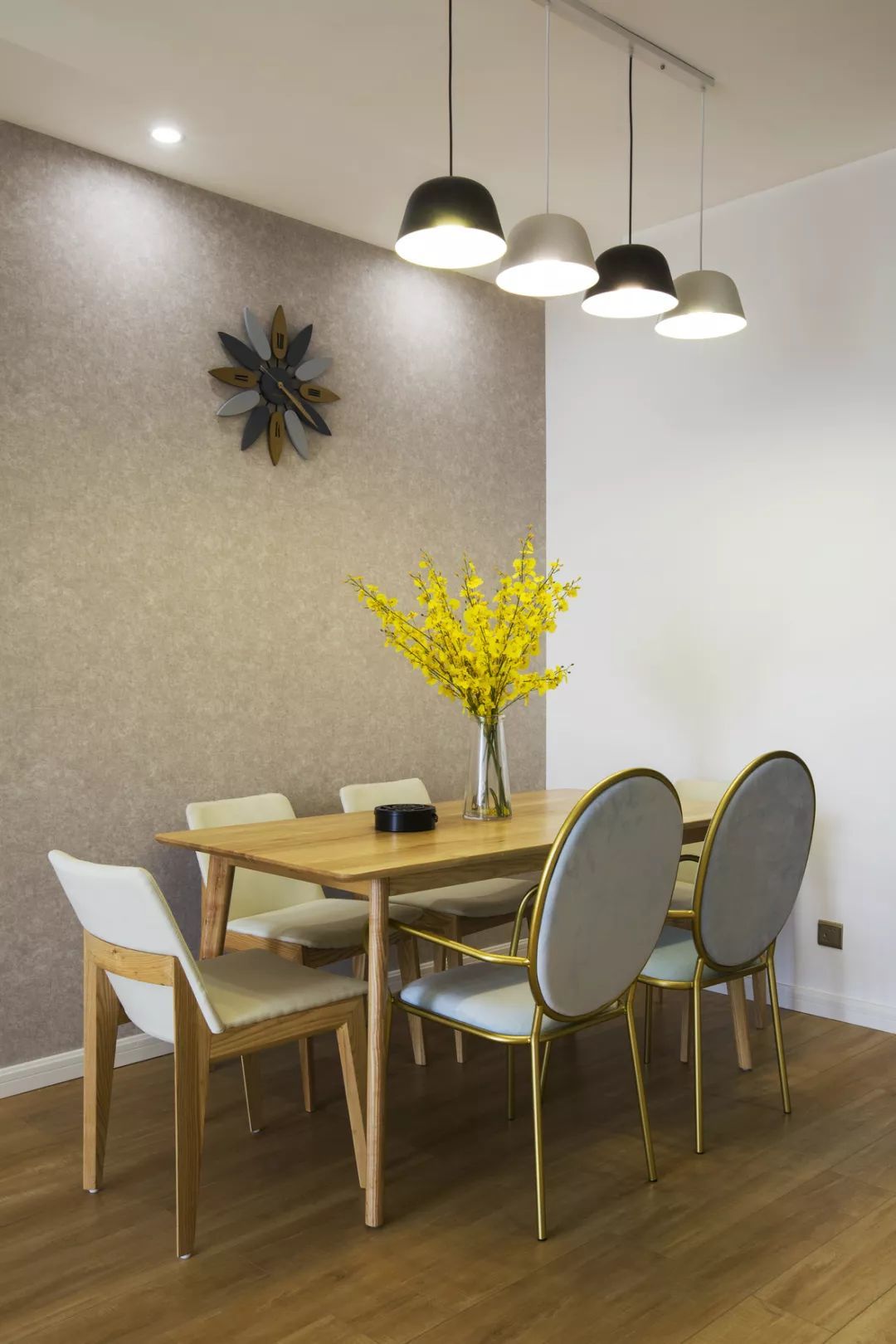 ▲餐厅背景墙贴上灰色朦胧感的墙布,挂一个造型独特的时钟,让餐厅空间显得简约优雅而温馨自然,在这个空间用餐,情趣格调而优雅。