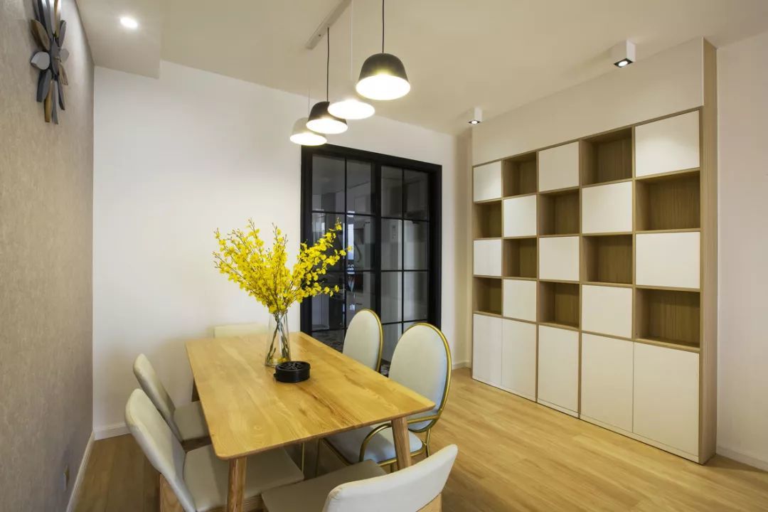 ▲实木餐桌搭配皮艺餐椅,餐桌上方装一排吊灯,餐厅后方过道装一排定制餐边柜,定制餐边柜以开放+封闭柜组合,提供了一个展示与收纳功能兼具的餐边柜设计。