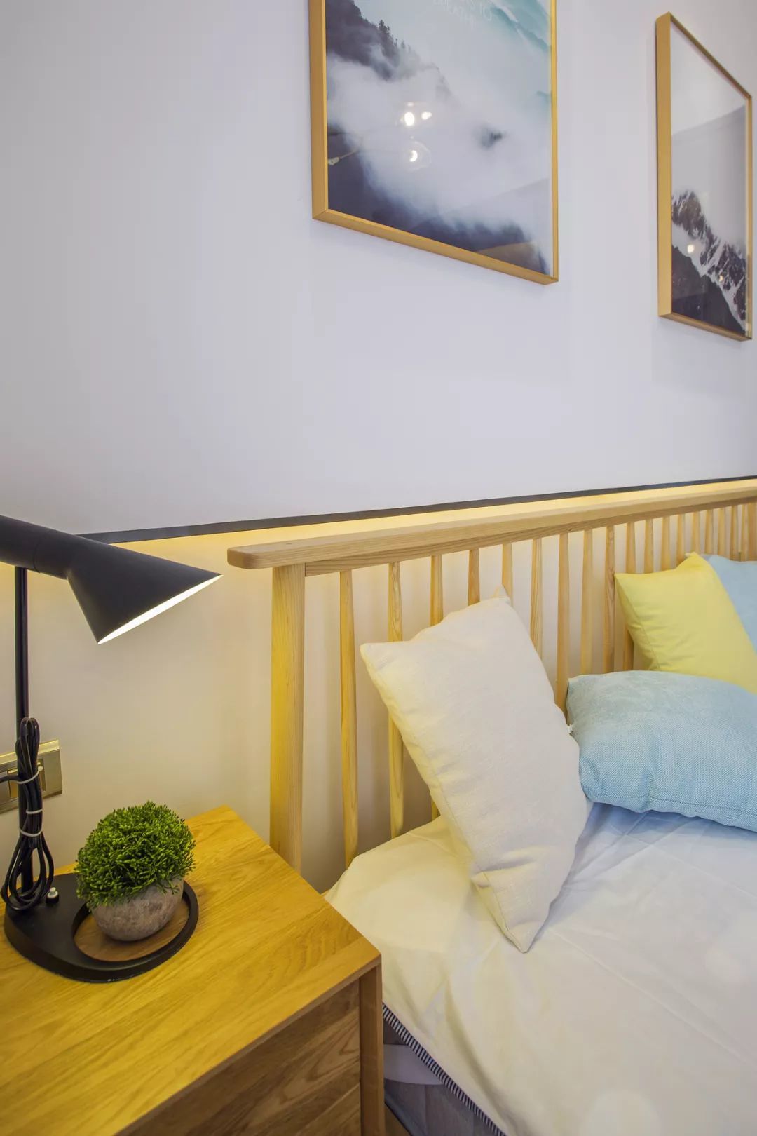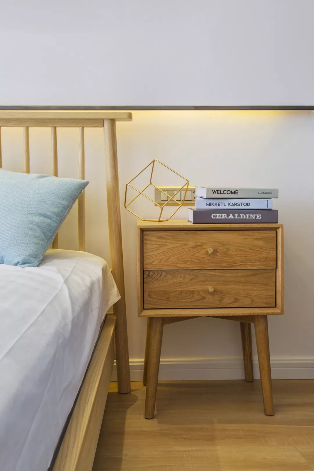 ▲床头两侧摆上实木床头柜,布置床头台灯,床头墙加入暗藏灯带的设计,让空间显得简约温馨而明亮惬意。