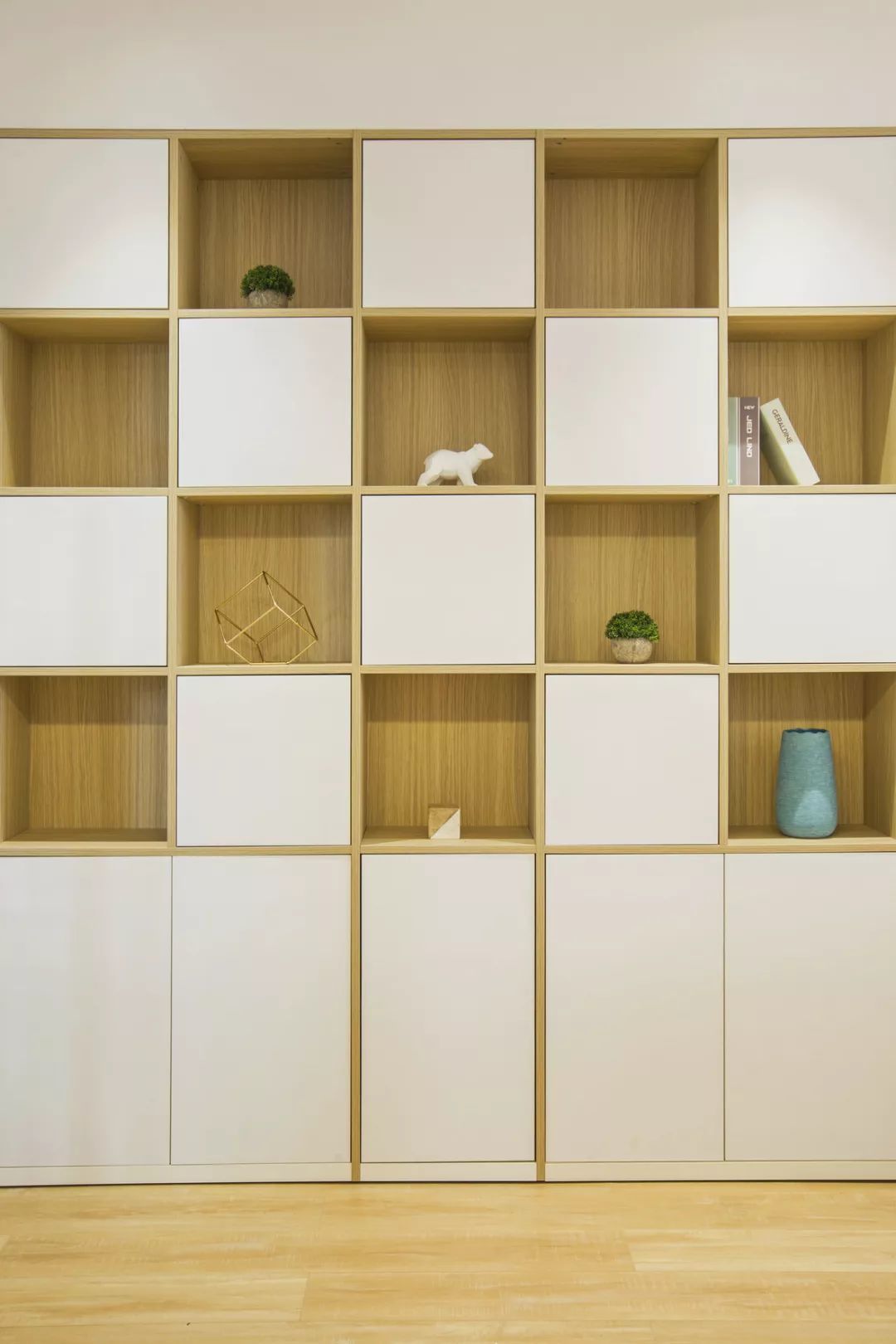 ▲开放格内摆上精致的摆饰品,在原木色与白色柜门的组合下,显得简约而优雅精致。