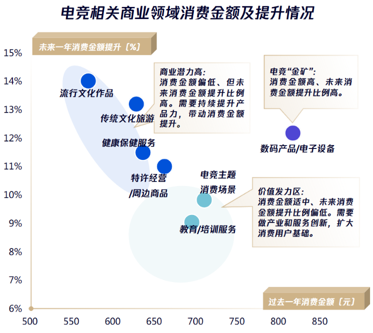 随着电竞用户数量的增加,还有消费习惯的养成,行业的市场规模也将继续增长,进而带动周边产业的发展。2022年,87.3%的中国电竞用户都有过消费,较去年数据上涨9.6%。数码产品/电子设备、电竞主题场景和流行文化方面,是消费渗透最高的三个领域。周边商品等领域,还有不小的消费潜力可以挖掘。