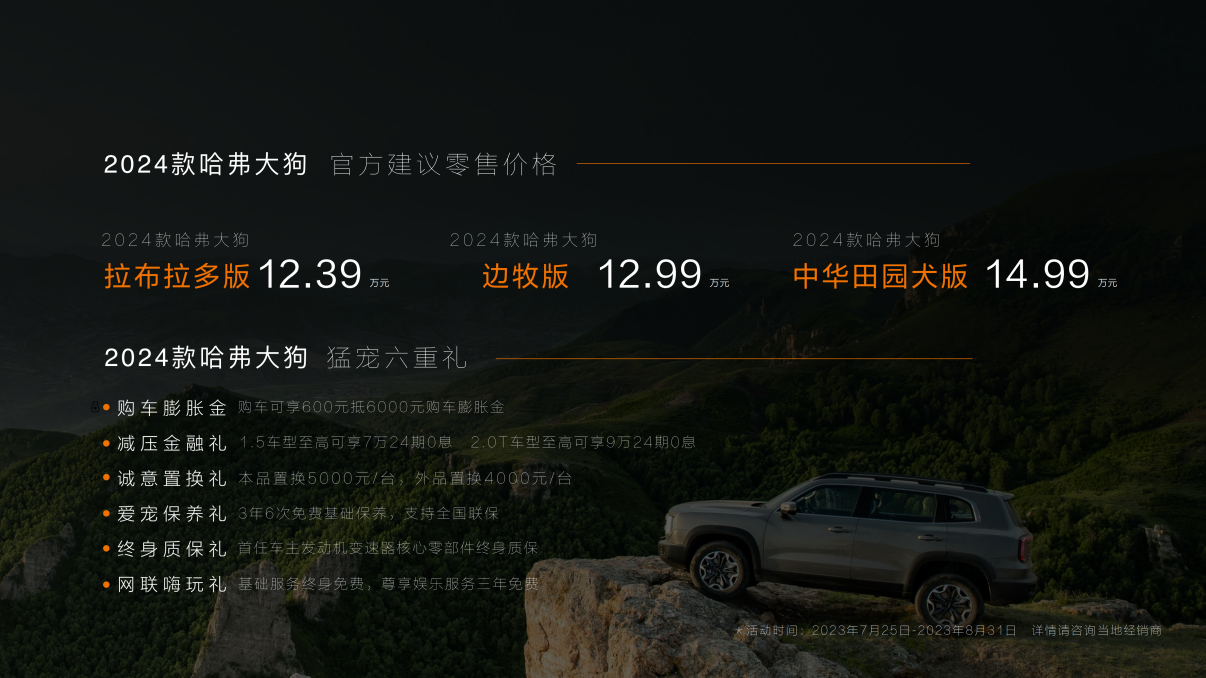 7月25日,2024款哈弗大狗正式上市,共推出拉布拉多版 、边牧版和中华田园犬三款车型,售价区间为12.39-14.99万元。