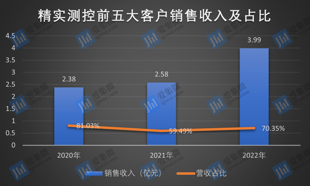 不过,受消费电子、新能源汽车及白色家电等下游行业品牌集中度较高等因素影响,智能装备制造行业内企业主要客户往往较为集中。2020年至2022年,精实测控对前五大客户的销售收入为2.38亿元、2.58亿元、3.99亿元,占营业收入的比例分别为 81.03%、59.49%和 70.35%,集中度相对较高。