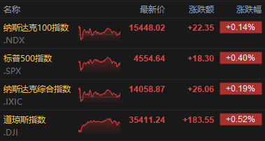 美股方面,三大指数集体收涨。标普500指数收涨18.30点,涨幅0.40%,报4554.64点;道指收涨183.55点,涨幅0.52%,报35411.24点;纳指收涨26.06点,涨幅0.19%,报14058.87点;纳指100涨0.14%。