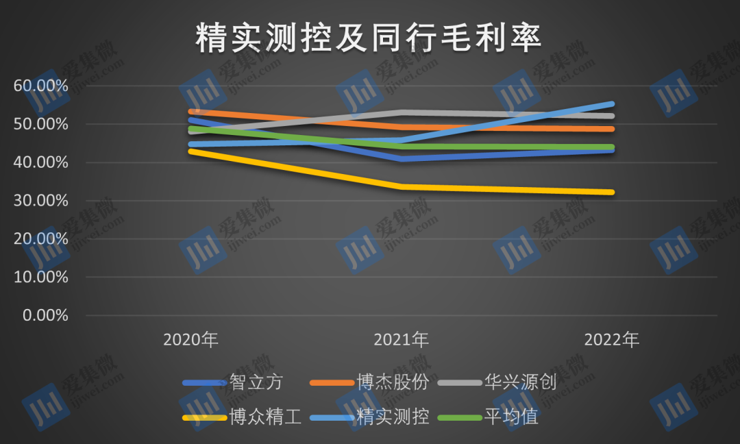 对比同行,智立方、博杰股份、华兴源创、博众精工毛利率平均值分别为48.83%、44.20%、44.07%,精实测控与之较为接近。