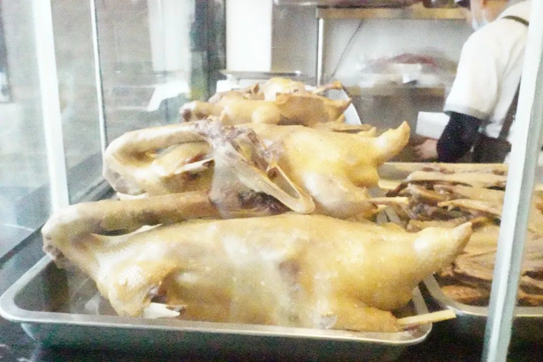 据其介绍,贡鹅需要选用优质鹅肉、调制独特的腌制汁等。随后将我们带到后厨,有一口充满浓汤的大锅,亲眼目睹了师傅们将鲜嫩的鹅脯腌制至入味,随后还参观了挂鹅、冷冻室等地方,最终呈现出色香味俱佳的贡鹅佳肴。在卤鹅过程中,我们观察到,每隔一段时间师傅就要翻动一下鹅身,为的就是保证鹅面受热均匀,使卤汁能够全面地流到鹅肉的各个部位。