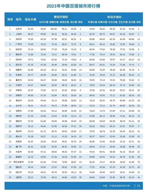 近日,华顿经济研究院在上海发布2023年中国百强城市排行榜。北京(92.46)、上海(89.47)继续稳坐前两位,大幅领先于第三位深圳(78.95),而深圳也逐渐拉大了与广州(74.99)的差距,进一步坐稳中国第三城位置。广州与第五位杭州(74.15)之间的差距近年来不断缩小,杭州硬经济实力已经超过广州,软经济指标中,文化和卫生实力也优势明显。