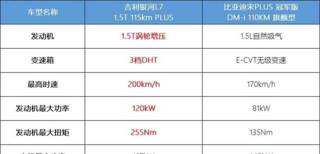 除了电池系统,在选车时候,最重要的部件莫过于动力总成部分。吉利银河L7采用是1.5T涡轮增压发动机和电动机组成的动力单元,变速箱则是3档DHT;比亚迪宋PLUS DM-i采用的是1.5L自然吸气发动机和单电机组成的动力单元,变速箱则是E-CVT无级变速箱。光从这硬件配置上,我们就能猜到吉利银河L7动力方面肯定会更加出色,从相关的参数中,也印证了这一点。