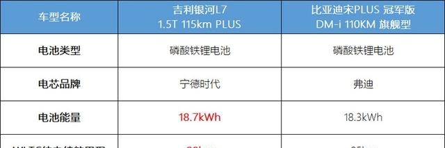 如果只看车型参数和配置表,你会发现吉利银河L7和比亚迪宋PLUS DM-i的电池区别并不大。一般媒体评测的话术应该会介绍到,吉利银河L7采用是18.7kWh的电池,会比比亚迪宋PLUS DM-i的18.3kWh稍大一些,带来的续航里程也会更长。