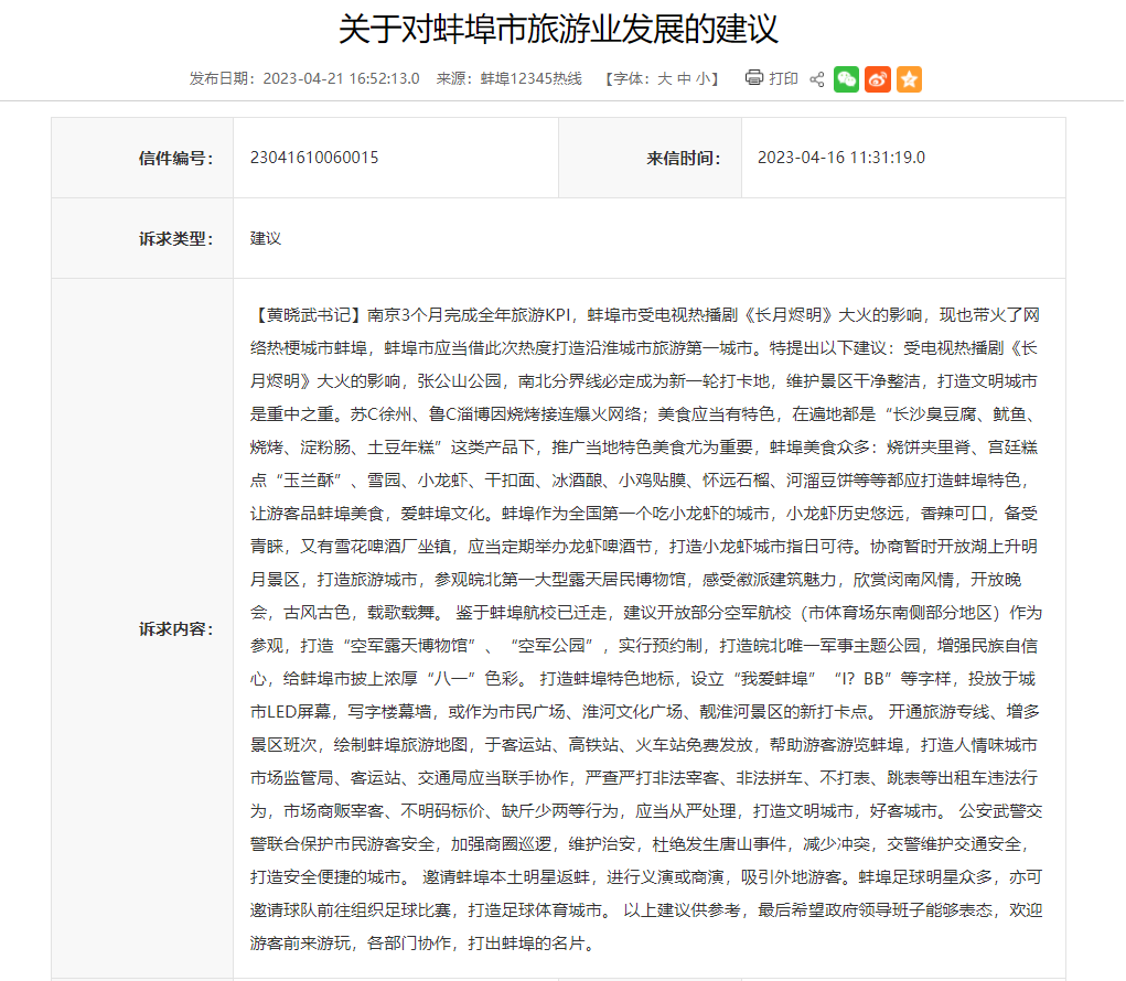 针对蚌埠旅游发展,网友不断建言献策,从旅游线路制定、视频宣传,到地标打造、美食推荐,点子覆盖方方面面。
