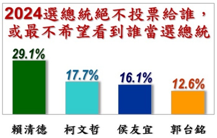 中评社台北7月26日电(记者 黄筱筠)《美丽岛电子报》今天公布7月份2024最新民调,民调询问绝对不会投给谁?或最不希望 看到谁当选“总统” ?结果显示,民进党参选人赖清德29.1%最高,台湾民众党柯文哲17.7%,中国国民党侯友宜16.1%,鸿海创办人郭台铭最低12.6%。